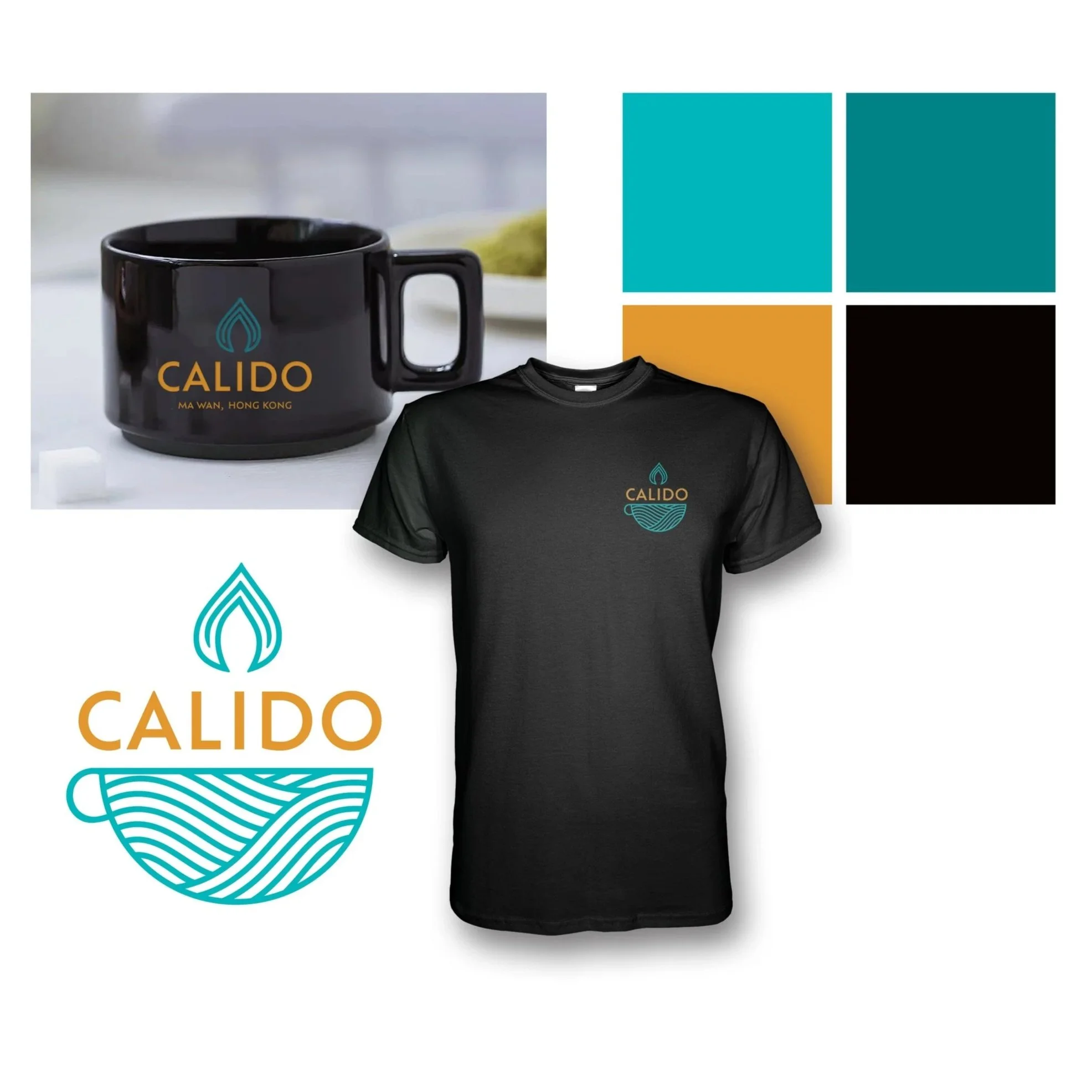 Calido is a Sri Lankan-inspired bar and restaurant based in Hong Kong, and the logo needed to bridge two culinary worlds in one mark. It centers on a flame-and-cup icon, where the flame represents the warmth and spice of Sri Lankan cuisine, and the cup's wave-like patterns nod to both the ocean at Calido Beach and the comfort of shared meals and drinks. A bold sans-serif wordmark ties it together, balancing approachability with the sophistication needed for an urban Hong Kong audience. The color palette of teal, golden yellow, and black grounds the design in the brand's tropical roots while keeping it feeling modern and cosmopolitan. The result is a logo built to work across signage, menus, apparel, and digital platforms without losing any of its character.