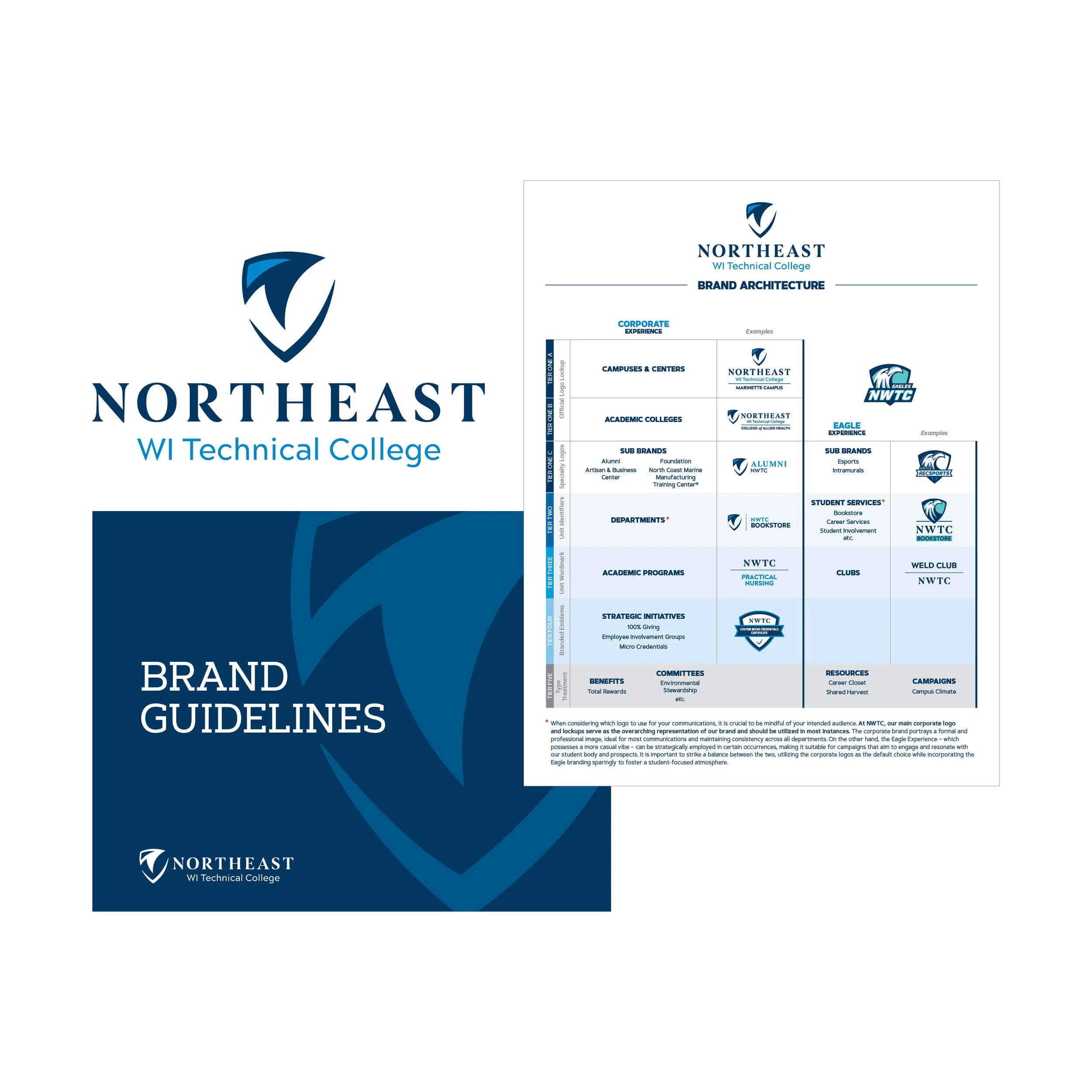 Northeast Wisconsin Technical College needed more than a brand guide. They needed a complete identity system built from the ground up. I led the design of the primary logo and all logo lockups, developed the brand architecture, a tiered hierarchy system that defines which departments, campuses, and units earn a logo, a lockup, a unit identifier, or a type treatment, bringing much-needed clarity and consistency to how the college presents itself across dozens of entities. Beyond the visual work, I also drove the brand strategy and co-wrote the copy that gives the guide its voice. The final document covers everything from logo usage and color palette to typography, photography standards, and marketing applications, giving hundreds of staff and faculty across multiple campuses the tools to tell the NWTC story with confidence. This was one of the most expansive and rewarding brand projects of my career.