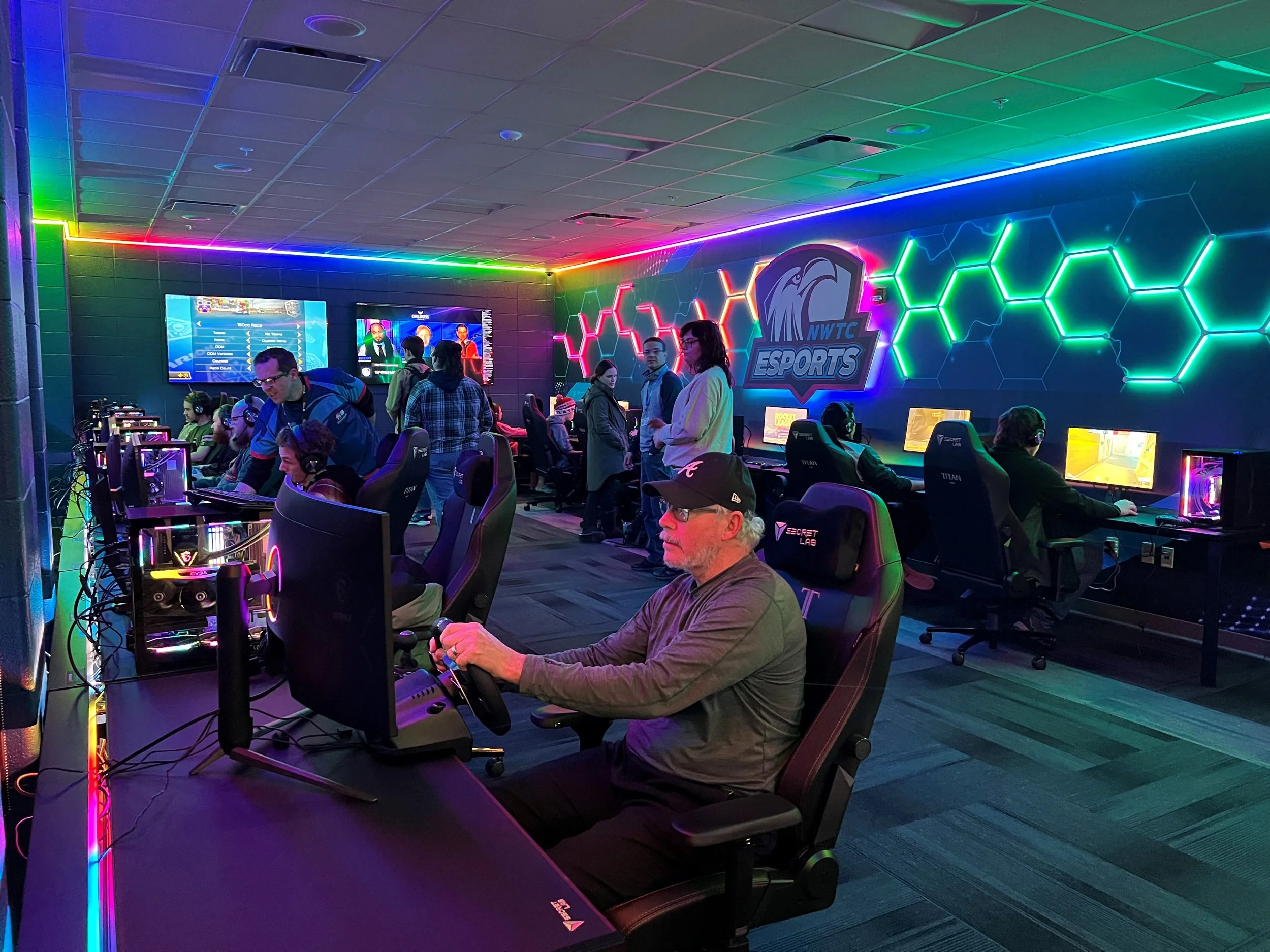 When NWTC set out to create a dedicated esports space, the design needed to do more than look cool. It needed to feel like it belonged to the students. I developed three distinct vision concepts for the room, each with its own identity, color story, tagline, and mascot logo variation, before Vision 3 was selected. The chosen direction was built around the values of connection, inclusivity, and community. Deep blues, purples, and pinks were intentional nods to both the gaming world and NWTC's existing iRespect! diversity and inclusion branding, signaling that this space was for everyone. A repeating hex map pattern, commonly used in game design, added a meaningful layer of authenticity, while the tagline "Changing the Game" reflected NWTC's forward-thinking approach to both technology and inclusion. The mascot logo was reimagined to give it its own identity within the space. The final design extended across wall graphics, window vinyl, desk wraps, glass etching, laser cutting, and screensavers, creating a fully immersive environment from floor to ceiling.