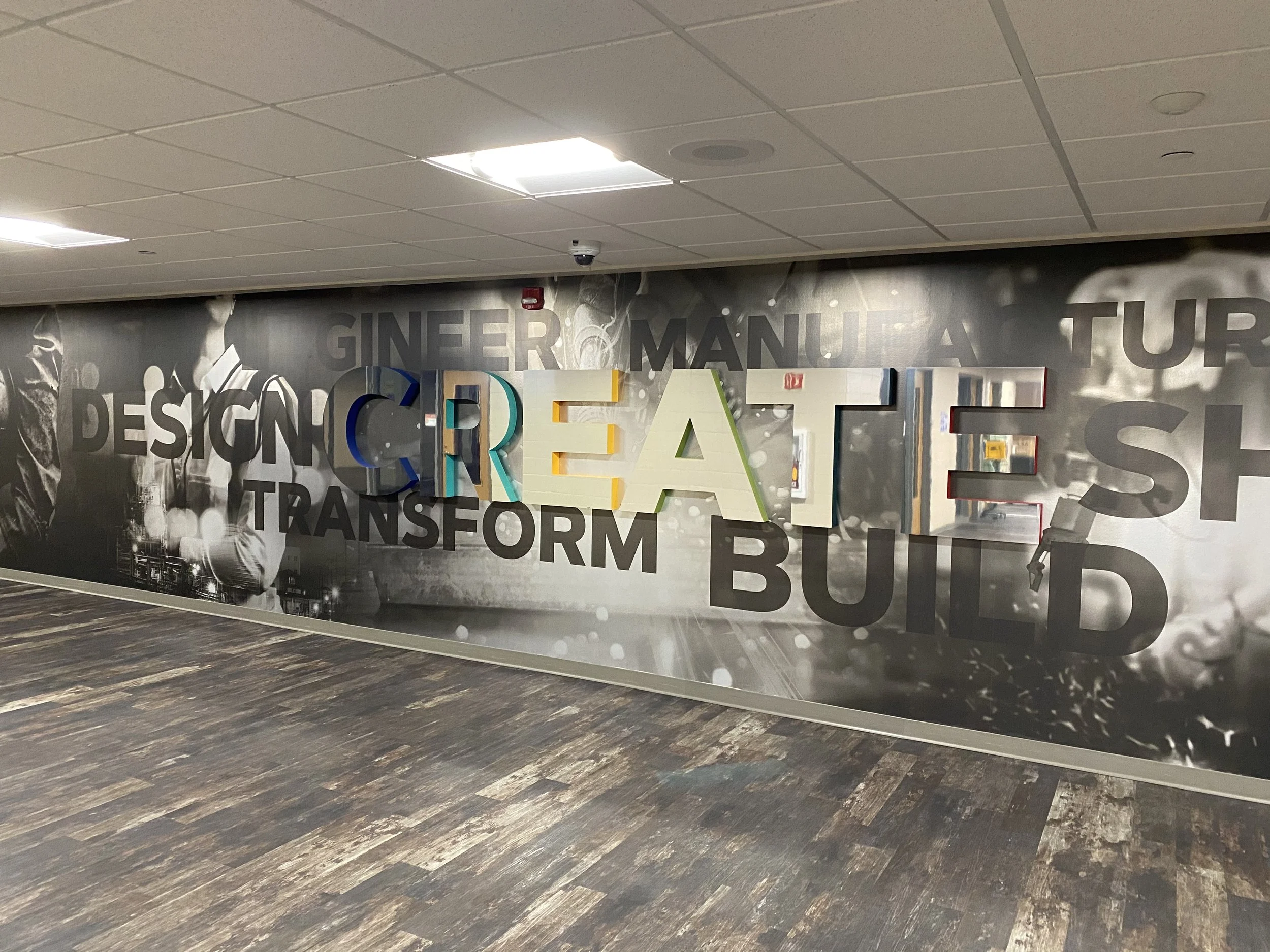 The Trades and Engineering Technology hallway needed a wall that could stop a student in their tracks and make them feel something. Starting with three distinct concept directions, ranging from mirrored typographic lettering to grand motivating imagery, the final design was a combination of concepts one and three, blending powerful monochromatic photography of tradespeople at work with bold 3-D lettering that literally jumps off the wall. Words like Engineer, Build, Design, Transform, and Shape were chosen intentionally to speak directly to the students walking that hallway every day, reminding them of the real-world impact of the skills they're building. The 3-D letters feature mirrored fronts with bright color pops on the sides, adding dimension and energy, while the background carries a metallic finish that ties into the wallpaper used throughout the same hallway. The imagery wraps around corners to create a seamless, immersive experience rather than a flat graphic on a single surface. It's the kind of environmental design that doesn't just decorate a space, it defines it.