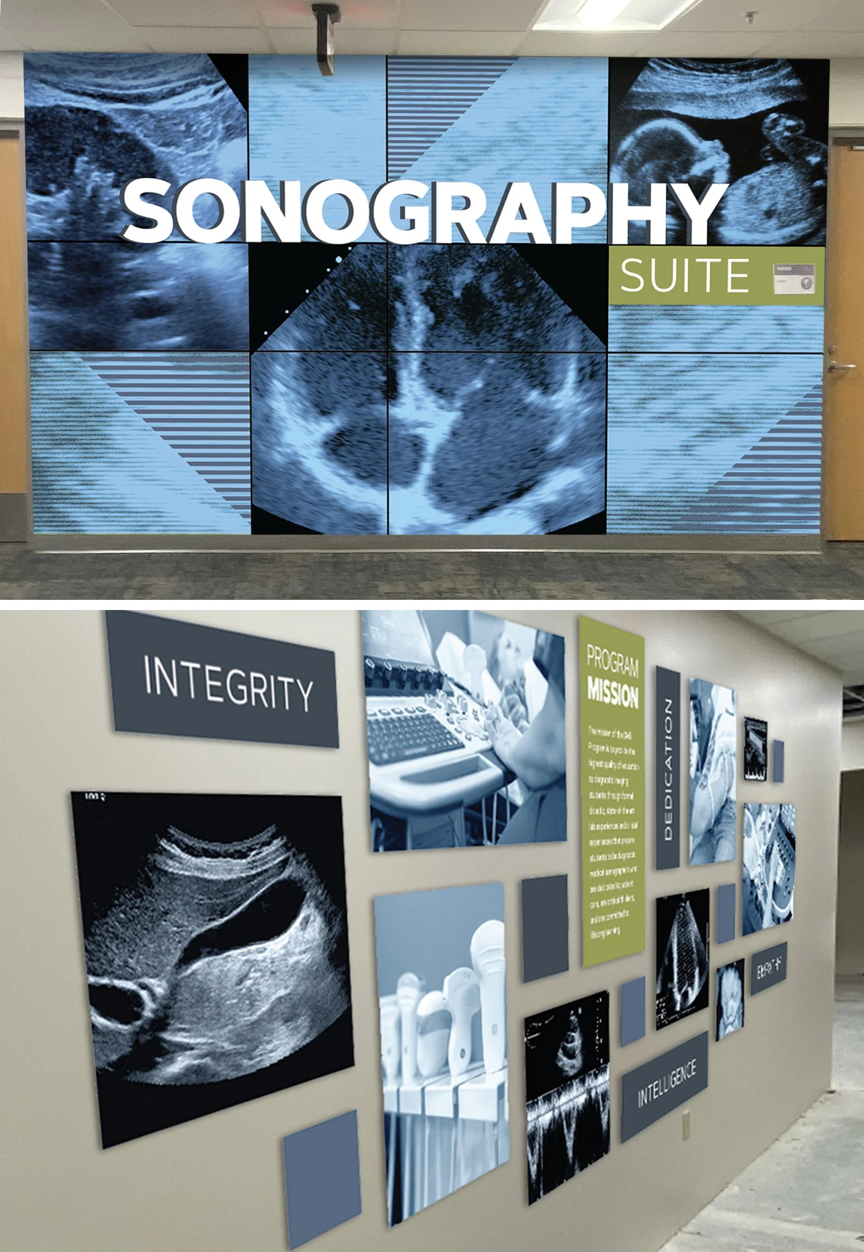 The Sonography Suite needed environmental graphics that felt as precise and purposeful as the program itself. The design spans two distinct spaces, a main hallway wall and a lab entrance wall, each with its own function but tied together by a cohesive visual language. For the main wall, a large-scale close-up of an ultrasound image forms the background, immediately grounding visitors in the world of diagnostic imaging. A light blue color palette adds brightness to the hallway while the grid-like pattern and muted tones were carefully coordinated with the surrounding interior design elements, including the fabrics and flooring already present in the Health Science lower level. The word SONOGRAPHY was produced as 3-dimensional lettering with painted sides, allowing it to pop off the wall and create a focal point that commands attention from down the hall.